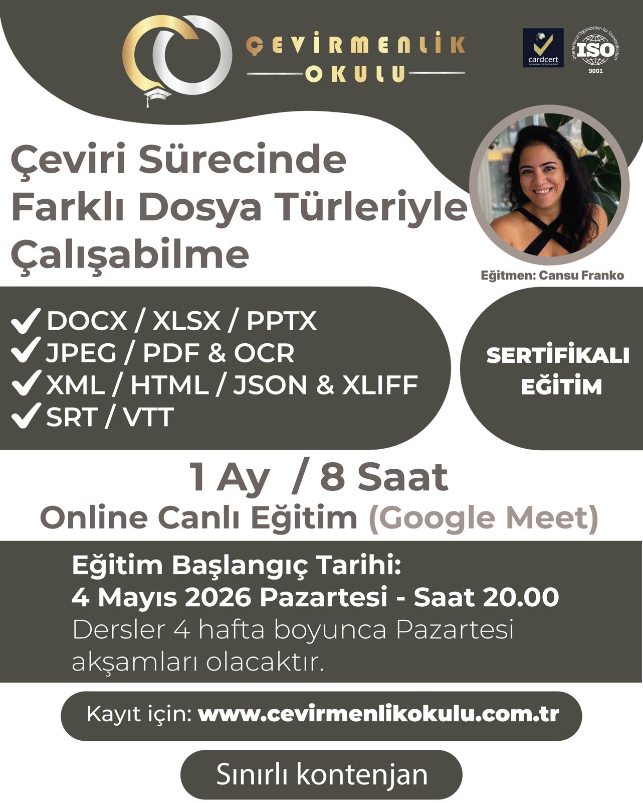 Bu eğitimin amacı, çeviri öğrencilerin farklı dosya formatlarıyla karşılaştığında paniklemek yerine sistematik biçimde hareket edebilmesini sağlamaktır. Katılımcılar her dosya türünün mantığını kavrayacak ve gerçek proje senaryolarına hazır hale gelecektir.
